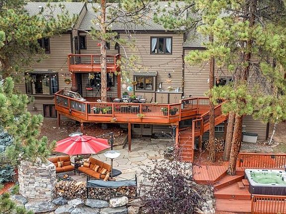 Tastefully Updated West Evergreen Residence. Welcoming mountain contemporary living, handsome stone blend nicely with the wood sided and high dramatic roof lines peak through the towing pines. Brick pavers lead to the rustic knotty wood front door and to the slate entry foyer. To the right is the private office and half bath; to the left and above is the hardwood staircase inlayed with hand forged stair rails. Straight ahead is the formal dining area, adjacent to the cozy living room warmed by a floor to ceiling moss rock fireplace with a large sun filled bay window. The remodeled kitchen is the heartbeat of the home boasting knotty Alder cabinetry, with display cabinets, tile backsplash, a desk workstation, a kitchen island complimented with a nice stainless-steel appliance package. An eat in kitchen bar backs to the family room making for a great entertainment room with a second fireplace and easy access to the deck. The primary suite and three additional bedrooms are located on the upper level and two updated bathrooms. The walkout lower level is configured as an in-law set-up with a wet bar, recreation room, bonus room and full bathroom. The back deck layout and patio provide a wonderful outdoor living space, multiple levels and can accommodate a large group or an intimate family gathering. The hot tub and fireplace complete this outdoor oasis. Sunny, level acre. Private & serene; neighbors are nearby. Groomed park-like setting with towering pines and quaking aspen. Convenient to Elementary school, and everything in Evergreen. Only 40 minutes to Denver.