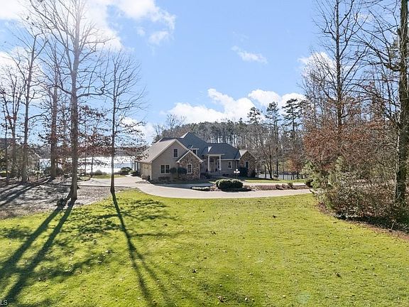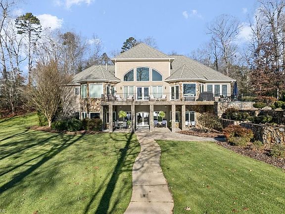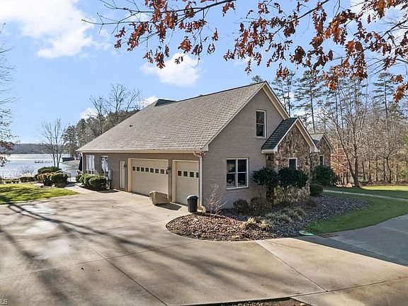 GORGEOUS CUSTOM luxury lakefront estate on 2.97 acres w/ 300+ ft waterfront/NO HOA/LEVEL LOT/toes in water from home in seconds/expansive lake views from every room. Professional landscaping, exterior lighting & custom stonework. Quiet cove w/ low winds. High ceilings, open floor plan, gourmet kitchen, Monogram appliances, sunroom, primary suite on main with spectacular views, huge walk-in closet w/ built-in furniture, jetted tub and huge shower. Walk out basement/wet bar/billiards room/We-Cave/Sports bar w/ 3 TV's/poker table area/darts. Entertain up and down! Huge upper deck, lower level patio, perfect for relaxing and entertaining. Tons of storage/freshly painted dock w/ boat lift. New storage building 12 x 28. Golf chipping range, gun range, 30 x 60 Pickleball pad ready to finish. Best lake orientation to enjoy afternoons/evenings on the deck w/o sun blare. 12 mins to freeway. Central NC Location. 2hr drive to MOUNTAINS & 3 1/2hr drive to the BEACH!