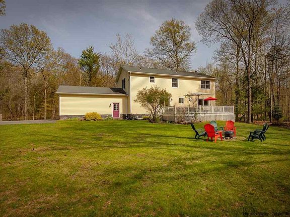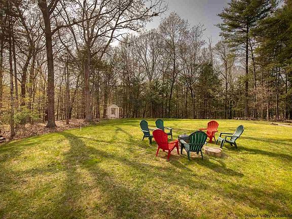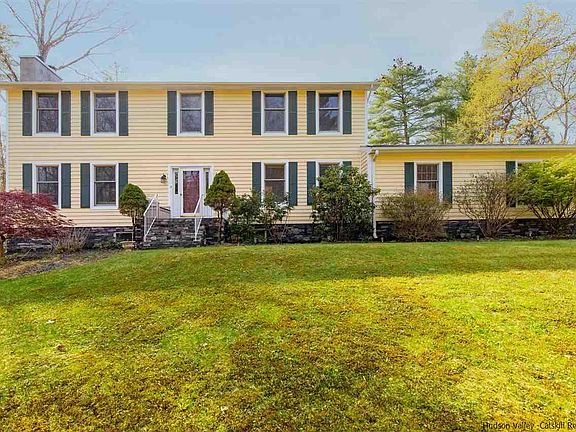This wonderfully spacious colonial sits on a lovely 2.6-acre parcel on much desired Marcott Road in Marbletown. In addition to enough bedrooms for a large family or a lot of guests, there's also plenty of living space, with a dining room in addition to the kitchen's eat-in area, a living room (currently set up as a home office), and a family room with a wood-burning fireplace. The generous primary bedroom suite features a bathroom with double sinks and a large walk-in closet, and there are double sinks in the guest bathroom as well. There are hardwood floors throughout the house and bathroom floors are ceramic tile. There's a direct entrance from the attached two-car garage which leads into a laundry/mudroom, as well as one which leads to the full basement. The expansive rear deck, accessed from the kitchen and dining room, overlooks the lush property and is a delightful extension of the living space during warmer months. The home is set back nicely from the road and the rear yard is surrounded by light woods, and access to the rail trail is just up the road. The nearby towns of Stone Ridge, High Falls, Woodstock and vibrant Kingston offer plenty to do and multiple ski areas are under an hour away.