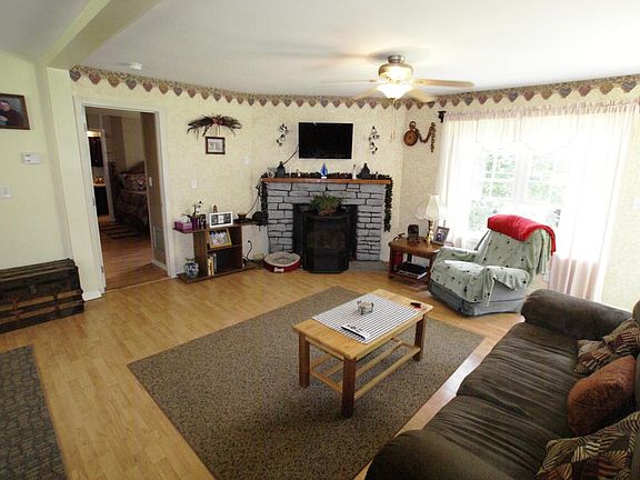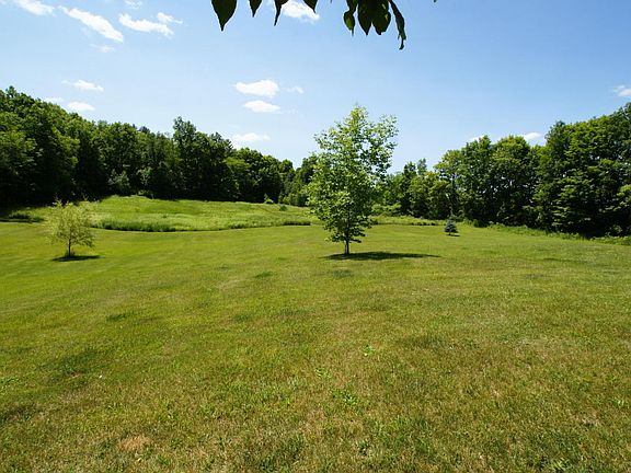 Great country home setting with knoll top ranch in large 7 plus acres of rolling meadow surrounded by woods & year round babbling brook! Home features huge living room with gas fireplace & dining or computer area, fully applianced kitchen with oak cabinets island and dining space, master bedroom and bath, 2 more bedrooms and second bath, big walk out basement with partially completed game room, beat the heat above ground pool & deck, detached workshop, shed, view sitting deck, garden space, heating system AC coil ready, abundant wildlife, quiet country road location.