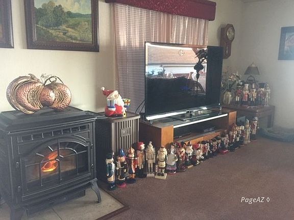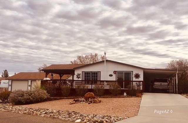This heart of this 1995 Palm Harbor home consist of a large covered Patio, Living Room, Dining Room & Kitchen areas. From these areas you have views of the Kapariwits to the north and Lake Powell to the east. The present owners have continually upgraded the home since they purchased it in 2006. The custom kitchen has newer appliances, including a Jenn-Air range (propane) & oven (electric),custom cabinets, granite counter tops & wood flooring. The Living & Dining Rooms flow together with a centered Quadra Pellet stove. The over sized Master Bedroom has a beautiful attached bathroom with a Jacuzzi tub & doors to the outdoor gazebo with a Jacuzzi area. The second bedrooms is being used as an office & the third is a welcoming guest room. There is also an attached 11'6" x 15' Quilting/Sewing Room with lots of shelves & its own heating/cooling system. The .38 area lot is fenced & has an entertainment area, garden area, fruit trees, grape vines & extremely beautiful landscaping which is on an automatic irrigation system. There is a three car 1200sf garage, a two car carport & boat pad. Please review the information & call me for an appointment to see all the other amazing item