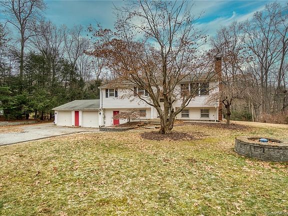 Welcome to this terrific home on a private, nearly 1 acre lot in quiet Coventry. The front features a half circle drive with room to park a trailer or toys next to the house, extensive hardscape retaining walls, covered porch and pedestrian doors to the walk out basement as well as the oversize two car garage. The rear yard has a large deck overlooking a fully fenced area perfect for pets or play. Inside the main floor features hardwood floors in the bedrooms, hallway and living room with fireplace, and the master bedroom with it's own private half bathroom. The kitchen and dining room open to the living room, have easy care tile floors, some recessed lighting and an exit to the rear deck. There is one finished room in the lower level plus a large area perfect for a family room, workshop or flex use space to suit your needs, ready for you to finish. Comfy Central Air conditioning and baseboard heat with new oil tank, well maintained boiler with indirect hot water reserve tank. The well tank is new and the home features 200 amp electrical service. Other updates include the front large window in living room, front door and lower doors to garage and front walk out from basement. Some loose ends to be cleaned up but an overall great home and location. This is an as is sale.