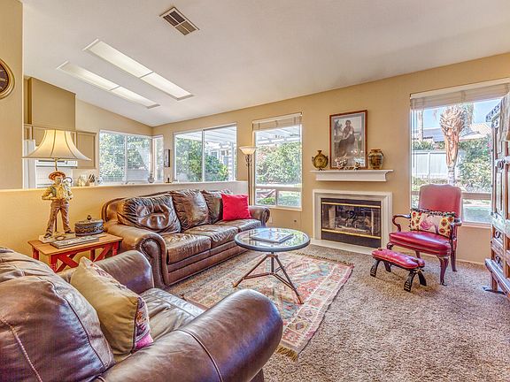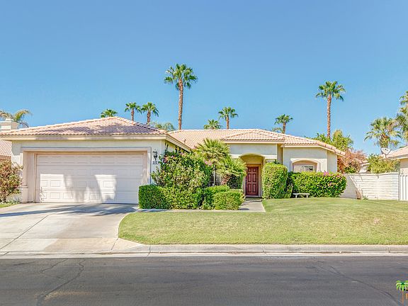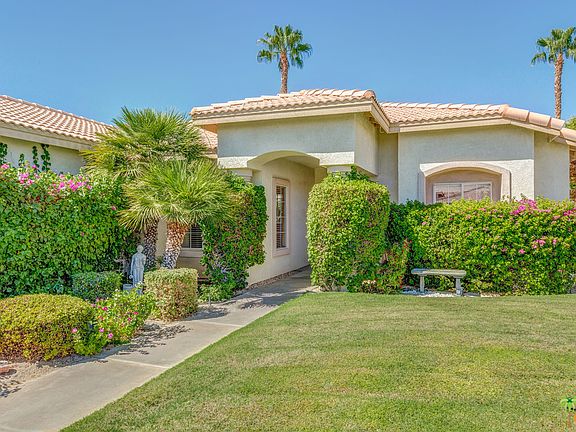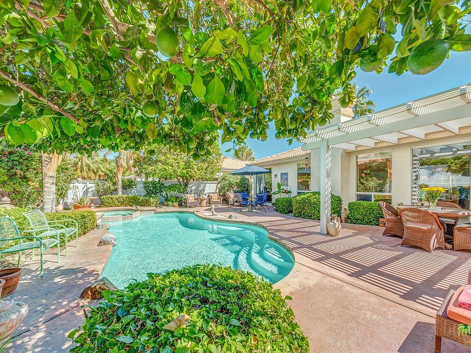 Welcome to Merano, a small and serene gated community located close to shops, restaurants, medical facilities and entertainment venues. This gorgeous home features two large master bedrooms on opposite sides of the home with full ensuite bathrooms and large closets. Both bedrooms open to the pool and spa area with beautiful sliding doors. It enjoys a kitchen and living room with vaulted ceilings, large windows and a sliding door overlooking the pool and spa, giving a bright and lively ambiance great for entertaining. The living room also includes a beautiful fireplace and there is an inviting dining area that can be used as an office, if desired. The north-facing back yard is paradise found with a heated pool and spa surrounded by greenery that includes citrus trees and roses. It boasts a beautiful Alumawood covered patio and plenty of seating for guests. It also has a laundry area conveniently located inside the home. Make this lovely home yours and truly enjoy the desert living.