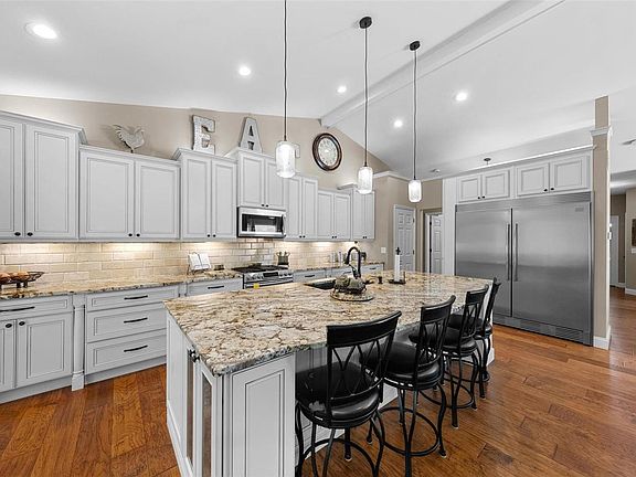 Prepare to be WOWED! This free standing villa checks all the boxes when it comes to low maint luxury! This atrium ranch has 2 BD (plus Flex Rm), 3 BA, updated Kitchen, wood flrs, screened porch, patio, finished LL w/a full Kitchen and backs to trees! The ext is rich w/brick-stone, arch shingles, exp aggregate drive, prof landscape and lawn irrig. Features inc 9 ft clngs, vaults, eng wood flrs, atrium stairs w/window wall, bay windows, 2 FP, dbl tilt low e windows, custom cab w/crown, granite c-tops, bev cooler, Frigidaire prof refrig, island w/seating bar, tile b-splash, pendant lights, main flr laundry, huge Primary Bdr, lux Primary bath, central vac, the list goes on. The finished LL is jaw dropping w/laminate flrs, tall pour, full Kit, Rec/Fam Rm, bar, Flex Rm and bath. There is app 3,083 s/f of finished living space. Walk out to a custom exp agg patio and tree lined setting. One way in/out neighborhood in an amazing location. Easy access to Hwys 70, 370 and the YMCA is .3 miles! Location: Detached
