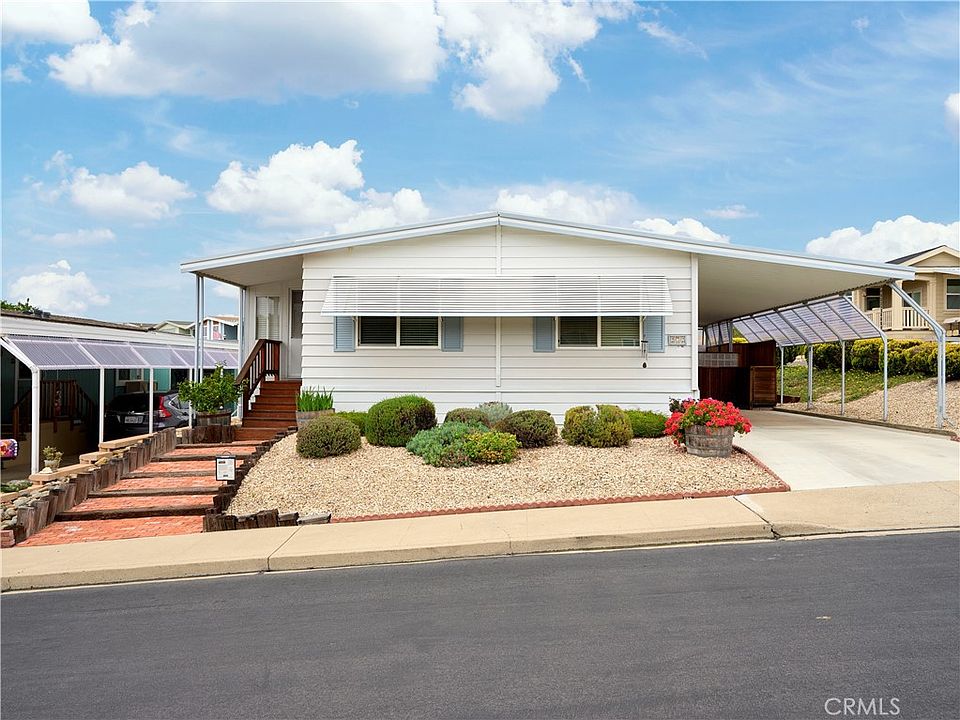 Super cute Sunrise Terrace home is waiting for you. Situated on a nice corner lot with an easy-care yard, this home offers 2 bedroom and 2 full bathrooms. The open floor plan allows for movement between the living room, kitchen, dining room and family room. Most walls have been drywalled and double pane windows have been installed. Sunshine streams in through the large skylight in the family room. Bedrooms have large, mirrored closets and Berber carpeting. The primary bedroom has extra built in drawers and cabinet. Attached bath features a linen cabinet and low entry shower. Bonus add on room is sunny and bright. It is waiting for you to decide what it will be, craft room, garden room, library, office, or whatever you can imagine. Beautiful, protected, outside deck offers a place to enjoy the great Central Coast weather. The extended carport has a secret...there is a hidden trash can storage space to keep them out of sight. A large shed in the backyard offers extra storage space or workshop space.