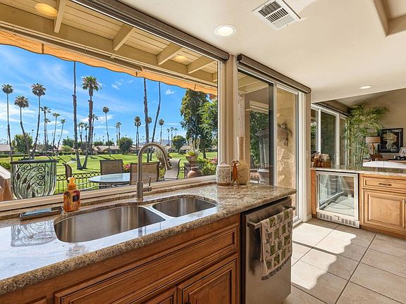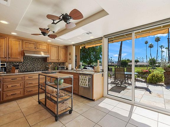 Beautiful fairway & mountain VIEWS and gorgeous sunrises from the extended patio of this REMODELED, 2BD+Den/2BA 300 Plan. Fantastic interior location, set back from the fairway and away from cart paths. Open floorplan with contemporary finishes and QUALITY throughout. Designer tile flooring & paint, stack-stone electric fireplace with inset flatscreen TV above, ceiling fans, LED lighting, custom window coverings, and energy efficient windows & sliders. Magnificent kitchen remodel features custom cabinetry with soft close drawers and undercabinet lighting, granite counters & tile backsplash, wine refrigerator, and stainless appliances with gas cooktop. Atrium has been converted and kitchen wall has been removed, adding a counter bar and a seamless flow into the living area. Wonderful cabinetry, tile, lighting & hardware in remodeled baths too. Spacious primary bedroom features a walk-in closet with built-in shelving. Large 2-car garage with epoxy floor, added insulation, additional storage, and recently replaced garage opener with insulated door. Professionally landscaped courtyard and custom metal entry door will welcome your guests. Water heater with circulating pump installed 2024. Just steps to a fantastic community pool & spa. 27 holes of Ted Robinson designed golf, 13 tennis courts, 20 pickleball courts, bocce, and 37 pools for your enjoyment. Centrally located in the heart of Palm Desert, Monterey CC is one of the most active clubs in the desert!