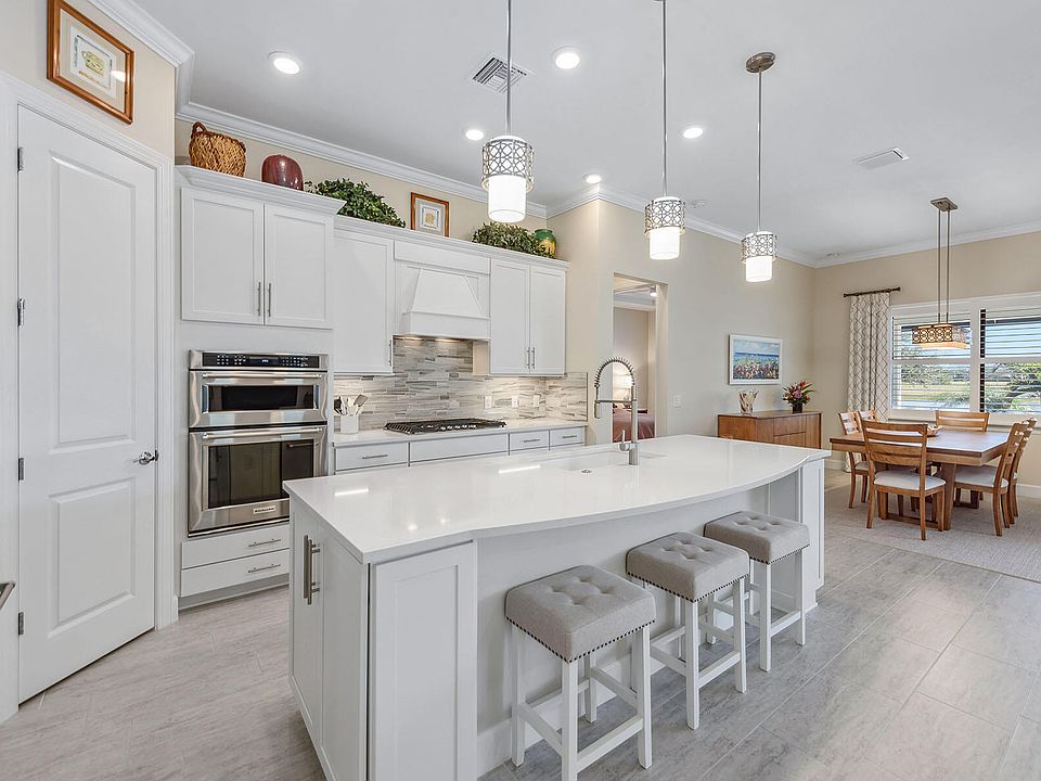 Pendant-lit islandSerene lake viewsExpansive screened-in lanaiOutdoor kitchenPristine saltwater poolGleaming quartz countertopsContemporary fans