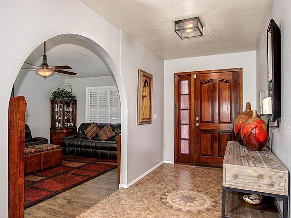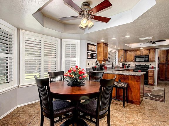 This beautiful, recently remodeled home is move in ready. As you enter, you will find 20 inch ceramic tile on the diagonal in the entry, family room, formal dining room, hallways, baths, office area and laundry room. The bedrooms and living room feature new laminate flooring. Windows are dual pane with sun screens and plantation shutters throughout. There are numerous ceiling fans, including one on the back patio. The newly painted house includes crown molding in all three bedrooms. Both bathrooms have been fully updated including mirrors, lighting, and granite countertops. The tub shower in the guest bathroom features subway tile and a glass door enclosure. The master bath has a lovely, large tiled shower. The living area boasts an open concept.