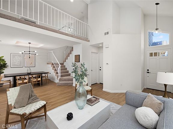 Tucked away in the charming neighborhood of Vista Santiago, this newly updated, end unit home features 3 bedrooms - plus a spacious loft - and 2.5 bathrooms. The light and bright main living area boasts vaulted ceiling, new flooring, fresh paint, designer light fixtures and cozy fireplace. The kitchen has been redesigned with freshly painted cabinets, new quartz countertop, new stainless-steel appliances and new cabinet hardware. The formal dining space is ideally located next to the kitchen, fashionably framed by a new statement chandelier. Up the newly carpeted staircase, the second level opens to a sprawling loft, ideal for an additional lounge area, game room, office, home gym or study space. The airy primary retreat boasts vaulted ceiling, new carpet and a large walk-in closet. The attached primary en-suite bath has dual sink vanity, new tile flooring and fresh paint. This ideal split bedroom floor plan features two additional bedrooms down the hall, with new carpet, vaulted ceilings and fresh paint. The hall bath has been updated with statement floor title, new paint and hardware. Enjoy the private backyard featuring a composite patio cover and low maintenance concrete patio. Attached two car garage with direct access into the home. The serene community of Vista Santiago features a sparkling pool and spa and lush landscape throughout. Conveniently located near all of the fine dining and shopping at the Orange Circle, walkable to Santiago Creek Trail and Grijalva Park, and ideally situated near Chapman University, Choc Hospital and transportation.