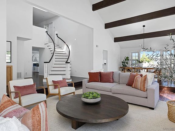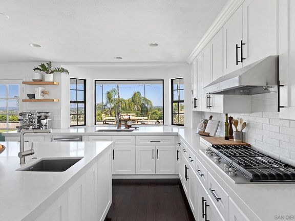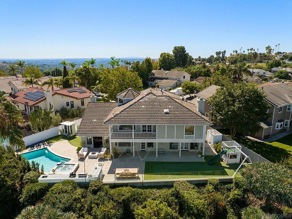 VIEWS, VIEWS, VIEWS! Welcome to this private, custom La Costa home that is not only beautiful on the inside, but has a yard that will blow you away with pool, jacuzzi, outdoor shower, putting green, firepit and views of the ocean and rolling hills! Full of character and located at the end of a cul-de-sac, this magazine-worthy home offers a grand staircase, soaring ceilings with warm wood beams, spacious living room with custom stone fireplace, airy dining room that opens to the view and yard, a new kitchen with oversized island, and five spacious bedrooms that you only get in a custom home! One secondary bedroom offers an en-suite, allowing for a secondary primary bedroom.