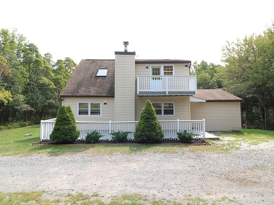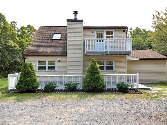 Revamped 5BR-2BA contemporary home is a MUST SEE! Redone kitchen has stainless steel appliances, tile flooring. Door off of kitchen is a bedroom that is currently being used as a family room. Open concept dining/living area with brick faced fireplace. 2nd bedroom on the 1st floor has a private balcony! Laundry area can be found next to the steps leading upstairs and beyond that is 1 full bathroom. 2nd floor features another 3 bedrooms with one of those bedrooms featuring another private balcony! Front deck, circular driveway, and side shed for extra storage! Community has indoor/outdoor pools, lakes, and more! Close to Kalahari Water Park, The Crossings, and other Pocono attractions!