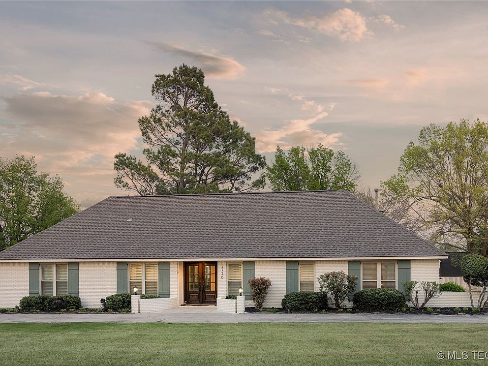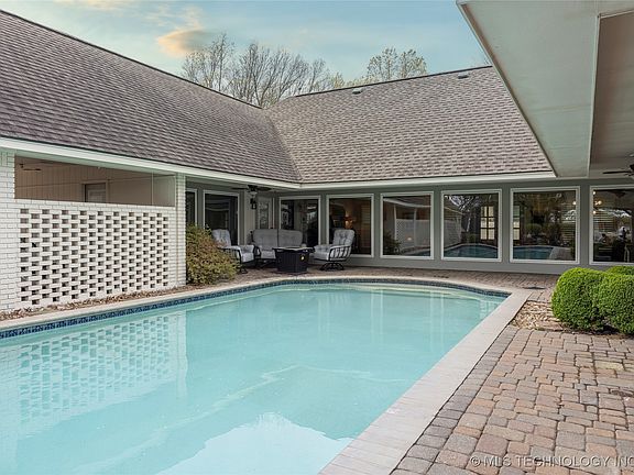 Situated on an expansive double lot near Muskogee Golf Club, this distinctive U-shaped home is designed around a breathtaking centerpiece: a sparkling gunite pool visible from every angle. The moment you enter, the view stops you in your tracks.
