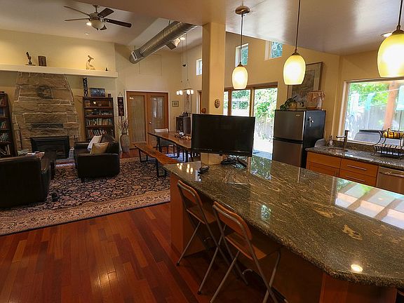 The house will be available unfurnished at the time on renting. Stunning custom Craftsman offers all of the amenities of the city while being tucked away privately in the trees. Serene outdoor spaces include a huge deck, creekside meditation platform & flagstone patio w/hot tub. Open concept living area w/soaring ceilings, cherry floors & stone fireplace. Kitchen features an expansive island, glass backsplash, SS appliances & a wall of cabinetry. Spa-like master retreat w/5 piece bath & WIC. Tons of parking, no steps to main level; too many features to list! Large and open common living area with a lot of pantry/cupboard space. 2 bedrooms tucked away share full bath. The den off of main living area also has a full bath, as well as a smaller bedroom. All on same floor, street level. The master suite is on top of garage and has its own entrance, walk in closet has W/D. Doors to large deck in den, as well as slider to patio from kitchen area. Staircase to lower covered deck, by a large water garden. Many mature trees all around. With attached garage and Airconditioning for those hot summer days. Renter is responsible for gas, water, sewer, and electricity bills. First and last month rents and deposit is due at signing. No Smoking allowed. Pets allowed on a case to case basis. Additional pet deposit may apply.