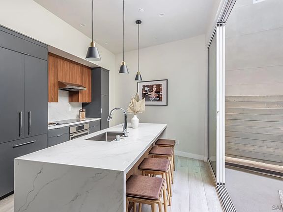 New construction Single family home, No HOA fees or Mello roos!11 foot ceilings and large windows bathe the space in natural light. Flexible 3story floor plan with 3b3b featuring Large downstairs bedroom and bath with separate entrance could be used as a separate rental, Arbnb, ect. Modern design with beautiful wide plank wood floors, waterfall kitchen counters and designer tiled baths. Prewired for full home automation, multi-zoned A/C and heat,electric car charger,3 patios, built in closet systems,spacious private direct access garage with lift to accommodate 2cars and additional driveway spaces.Views of SD downtown skyline from the covered patios. You'll love the walkable lifestyle mins to Little Italy.