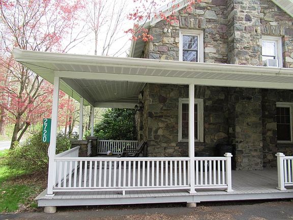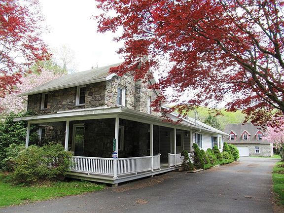 Stone Farmhouse on 2.3 acres in excellent central location. Steeped in local history, this home offers charm and beauty. The large great room addition creates a splendid gathering area to entertain family and friends. The beautiful wood work, cathedral tongue in groove ceiling, exposed stone and double bay windows create a desirable atmosphere. The home offers many built-ins and custom wooden blinds. The garage/carriage home was built from Rt 611 concrete and has endless possibilities if restored. You will love to relax on the front wrap around porch, or private back trex deck. Outside features include a stone smokehouse and BBQ. This home is zoned commercial allowing many different uses. Treat yourself today!