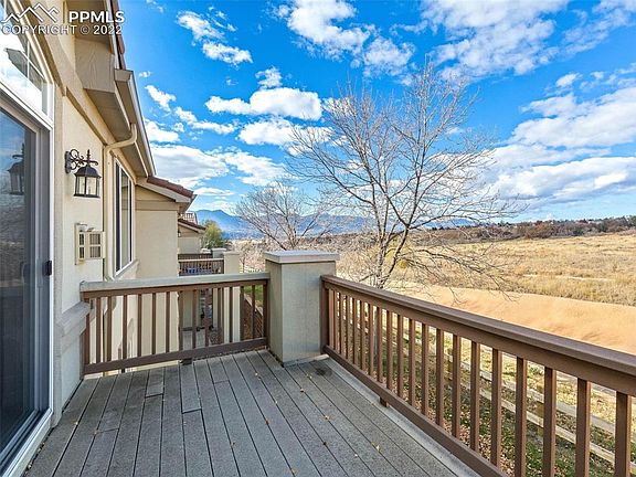 Exceptional end unit town house with walk out basement level backing to the Rampart Park open space. Sunny, open great room plan with a large, casual dining room area and cherry cabinetry in the kitchen. Primary Bedroom sits alone on the main level and looks out towards the open space. The attached bath has a soaking tub and stand-alone shower plus a walk-in closet. In the basement level are 9 foot oversized ceilings and two big bedrooms, each with their own walk-in closet. There is also a large recreation room that is perfect for media. The laundry room is at the bottom of the stairs and alongside the mechanical room. The home has a great, two-car garage and the luxury of a private community with lovely stucco and tile dwellings adding uniform character and charm. Conveniently located to all sorts of north side amenities, the residence is less minutes to the interstate, close to Academy D20 schools, and has the great benefit of the Rampart Park and Open Space just to the north. An exceptional opportunity awaits! There are virtually staged photos used.