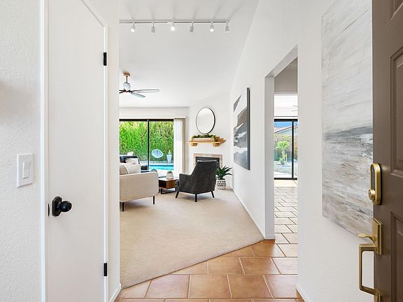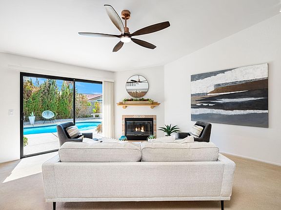 Remodeled pool home offered at the same price as nearby homes without pools! Located in the quiet, no HOA, Rio Vista neighborhood of Cathedral City! Thoughtfully remodeled, achieving a contemporary Southwestern aesthetic. Move-in ready with a perfect blend of comfort and style. The inviting living room features a cozy fireplace, fresh paint, and parallel to the rest of home has an abundance of natural lighting plus new LED overhead lighting. Enjoy your meal in style, surrounded by an artistic wall mural. The spacious master bedroom offers a walk-in closet, en-suite bathroom with dual sinks, and direct access to your private sparkling pool and spa. Pool upgrades include: Pentair 400 Series pool heater, newer pump and filter, freshly coated pool deck, and fun color-changing pool lights dual zoned for both spa and pool. The second bedroom also provides pool access through sliding glass doors. The bright kitchen shines with new backsplash, color matched green cabinets, white countertops, a workstation sink, a pantry, and a built-in desk area. Modern updates include recessed LED lighting, light fixtures, ceiling fans, and a smart thermostat. The oversized two-car garage comes with built-in cabinets and a workbench. Enjoy easy-maintenance desert landscaping with new crushed rock, citrus trees, and stylish, water-conserving desert landscaping. If you're looking for a wonderful home in a great neighborhood, this is it! Call today to schedule a showing!
