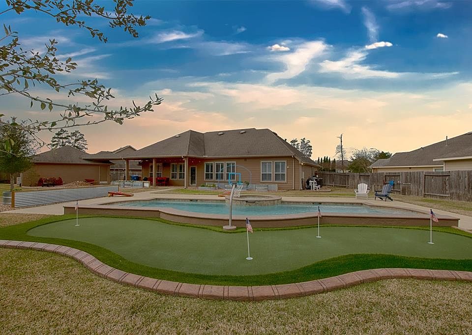 Gorgeous one story David Weekley Home on a almost 17,000 sq ft lot w/ 3 car oversized garage/mancave with a/c & heat,Pool, hot tub and a Putting Green!!. From the moment you pull in the driveway the pride of home ownership shines through. Entering from the front door the study with French doors is to your left and formal dining to your right. Large open family room with custom wood plank wall and kitchen, breakfast are all open concept which is perfect for entertaining Kitchen has granite counter tops, stainless steel appliances and walk in pantry. Split floor plan and extra/bonus room that can be used as another living area/gameroom/ etc. So many upgrades- Tile throughout the entire home (no carpet)*Plantation Shutters*Surround sound in the living room*8 exterior cameras*Bonus room has custom wood wall as well*Lush Landscaping in front and backyards*Whole house water filtration system* Utility with built-ins*Large Covered back patio! Call today for your private showing!