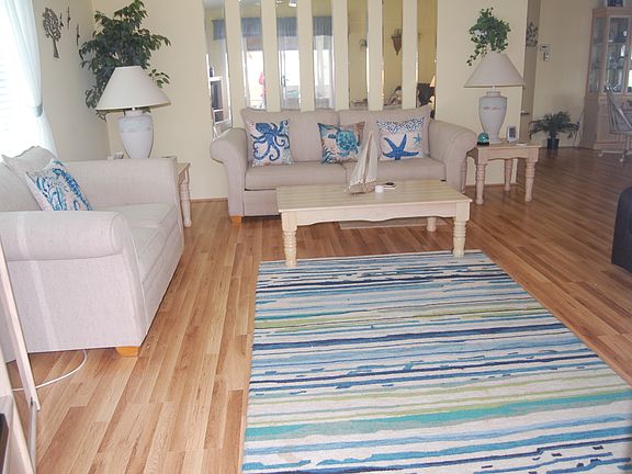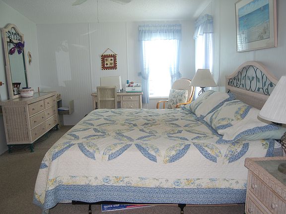Completely furnished with matching wicker bedroom sets, couches, end tables, lamps and other accessories. Fresh paint, never a smoker, new laminate floor, new French door refrigerator, and new king size bed. Includes cookware, dishes, TVs, curtains, lanai furniture. Separate shed with tools, carport for 2-3 cars.
