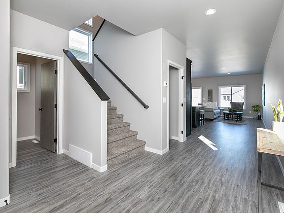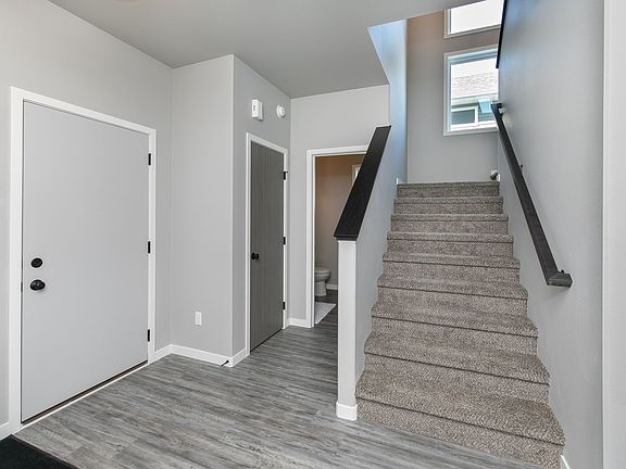 The primary bedroom is a serene retreat featuring double sinks and a walk-in closet. The upper-level laundry with a washer and dryer included adds convenience to daily life. You'll love the stunning vaulted ceilings, modern appliances, and beautiful granite countertops. Outside is perfect for relaxing and enjoying the lush green yard.