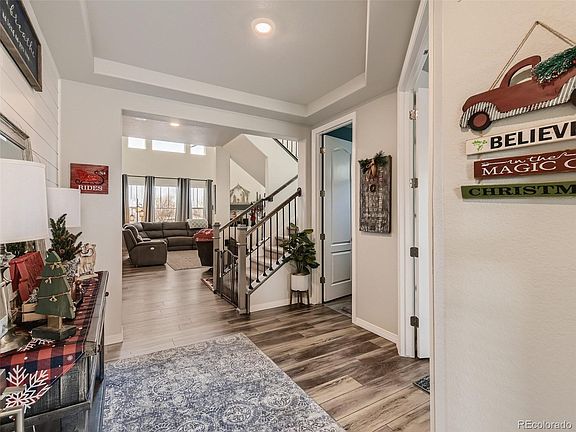 Come see this better than new home! Upgrades galore and has a functional and elegant floorpan. The main floor has all hard flooring to keep things neat and tidy. The kitchen is immaculate and features white cabinets, quartz countertops, stainless steel appliances, large pantry, kitchen island, gas stove, eating space and a bonus pocket office or drop zone hidden behind a custom barn door. The family room is large and cozy with a fireplace perfect for those cold Colorado Winters with custom mantle. The main floor has a large office that can also be used as a 5th bedroom. The second story has a large primary bedroom with tray ceiling, lots of windows, walk in closet and 5 piece en suite bathroom with large soaking tub. One upstairs bedroom has its own en suite bathroom and the other two bedrooms share a Jack and Jill bathroom. Huge backyard with open space behind is perfect for your Summer BBQs. Playset stays. Covered tree style deck. Also has a 4 car garage to park all your vehicles and toys. Large unfinished garden level basement is ready for your finishes. Convenient access to I-25, E-470, Costco, The Orchard Town Center and Denver Premium Outlets. Come and picture yourself in your new home!