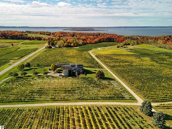 Old Mission Peninsula’s Most Photographed Home – Iconic Green Design by William McDonough. One-of-a-kind sustainable estate with 360° development, protected views of Grand Traverse Bay, vineyards, and orchards. Designed by world-renowned green architect William McDonough, this 5-bed, 6-bath home offers environmentally conscious luxury across 8.44 acres with producing vineyards (Merlot, Gamay Noir, Cabernet Franc, Chardonnay, Riesling). Features include a passive solar entry, indoor lap pool with panoramic windows, main floor art gallery, loft office with bay views, and a 50-ft underground wine cellar with redwood racks. Lower-level gallery includes a kitchenette, game room, and 3 bedrooms with stunning views. Designed for entertaining. Exquisite craftsmanship throughout: curved copper rooflines, steel columns with custom wood saddles, radiant floor heating, dual-zone HVAC, smart home system, 3 fireplaces, ADA-accessible 1¾" solid birch doors, granite countertops, Baldwin/Kohler fixtures, and custom cabinetry. Professionally landscaped with river and pond features. Two gardens could be re-imagined as additional decking. Sale of vineyard grapes to Black Star Farms can be negotiated. Additional 11.5-acre vineyard parcel available across the road. Sold as-is for the next visionary to make it theirs. A rare opportunity to own a celebrated architectural masterpiece.