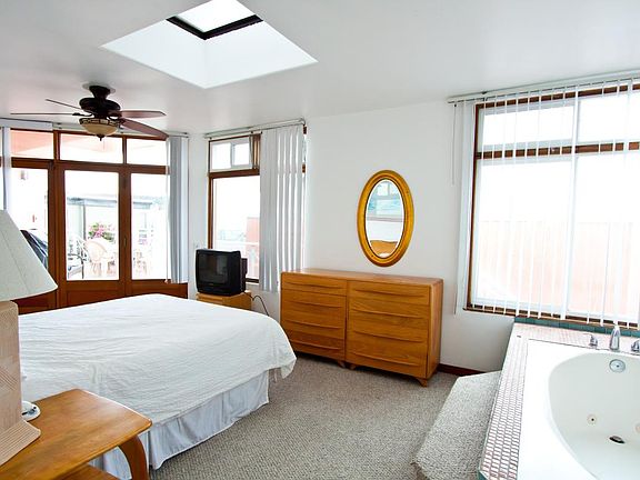This newer unit is 1200 square feet with two bedrooms and two bathrooms. There is a spacious kitchen, dining room, and living room area. The large deck faces the ocean looking over the garden walkway. It is very quiet! It has one queen bed/master, one queen bed, one twin bunk bed. Sleeps (5) Unit is Located on Second Flood in the Back Building. Guests have access to WIFI, Laundry, Cable, Free Labeled Parking UTILTIES INCLUDED