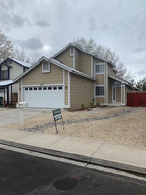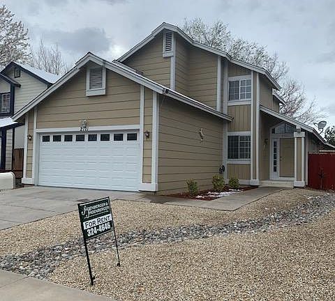 4 Bedrooms, 3 Bathrooms, 2 Car Garage. Rent $1995, Deposit $1985. 2,050 sq. ft. Includes fridge, D/W, W/D hookups, microwave, A/C and double pane windows. 2 pets of 40 lbs. or less upon approval with an additional deposit of $500 per pet. Newly refurbished best describes this beautiful home that is just a couple of minutes from Mira Loma Park/Rattlesnake Mountain Skatepark and the Mira Loma Shopping Center in Southeast Reno. Upgrades include a newly remodeled kitchen with brand new upgraded tile counter tops and back splash, refinished cabinets and all new stainless steel appliances; brand new 2-tone paint throughout; brand new light fixtures throughout; a brand new xeriscaped front yard and a large deck off of the 2nd story master bedroom. You will be instantly impressed the moment that you set foot in the house as the first thing you see is the formal living room with a very dramatic 2 story high ceiling and the formal dining area with a dramatic cathedral ceiling. The floor plan is very open with the aforementioned remodeled kitchen overlooking the family room with a brick accented real wood burning fireplace. There is one bedroom/office/den downstairs that is adjoined by one full hallway bath for maximum flexibility. The rest of the bedrooms and bathrooms are upstairs. The master suite is spacious with a large master bedroom that is enhanced by a cathedral ceiling, a ceiling fan and a large deck by way of a sliding glass door. The master bathroom includes his and hers sinks plus a shower/tub combination. Other features include tile flooring throughout the downstairs which includes the living room, dining room, kitchen, the family room, the bedroom, the bathroom and the laundry room; 2" faux wood blinds throughout and a nicely landscaped and very private backyard with a large paver stone patio that is partially covered and has a storage shed. Last but not least is Mira Loma Park that offers something for everyone with its mature trees, large expanses of grass, a rent-able picnic shelter, play grounds, ball fields, tennis courts, basketball courts and a par course all the way around the perimeter plus Rattlesnake Mountain Skatepark that is 40,000 square feet of concrete with over 30 features designed to enhance the skating experience with its own adjacent/separate parking lot with access from McCarran Boulevard. Mira Loma Shopping Center is right across the street from the Park and includes a Scolari's Supermarket, a CVS Pharmacy, a McDonalds, Port of Subs, Dollar Tree etc., etc. Landscape is tenant responsibility. Tenant pays G, E, W, T & S. 1 year lease. Tenant pays G, E, W, T & S. 1 year lease.