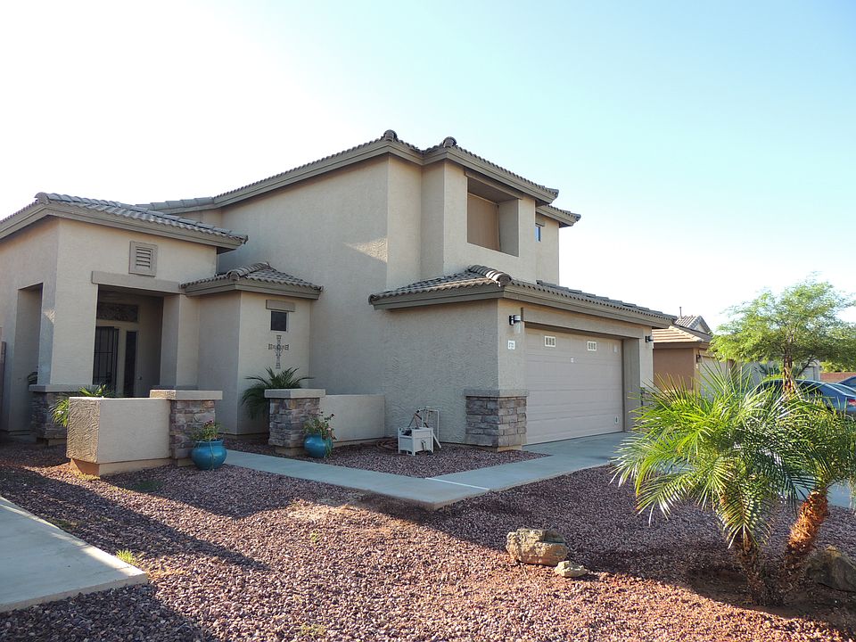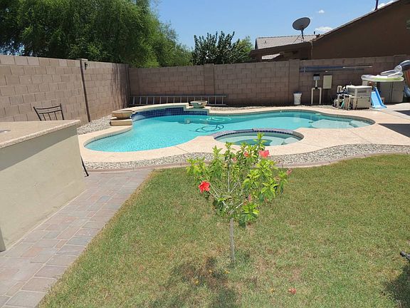 Timelessly alluring two-story, 4 bedroom, 3 bath 1,824 sq. ft Avondale abode in pristine condition. Manicured, low-upkeep desert landscaping in the front yard. Covered patio, lush green grass, desert landscaping, built-in BBQ, and sparkling pool/spa with built-in fountains in back. 2 car garage. Plush carpet and tile interior flooring. Soaring vaulted ceilings with pre-installed ceiling fans. Ultramodern, eat-in kitchen boasting overhead lighting, smooth, granite countertops, rich, custom cabinetry, and stainless steel appliances. Spacious family room, ideal for relaxation or entertainment. Luxurious full Master bath accommodates, providing vanity with double sinks, custom wood cabinetry, garden tub, walk-in shower, and private toilet room. Call ASAP to schedule your own private showing
