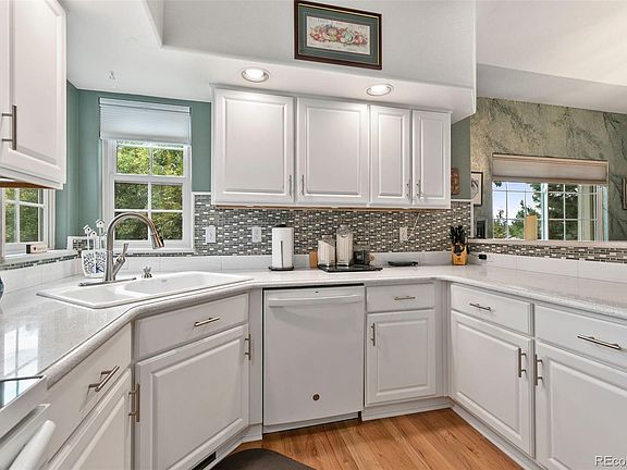 This gorgeous, well-maintained, west-facing townhome, located in the desirable Heritage Greens sub-division of the Legacy Ridge community, has ~2600 square feet of finished living space on two levels. The upper floor features vaulted ceilings over a spacious dining/living room area with an abundance of natural light. There is a tiled corner gas-log fireplace along with access to an outside deck situated on the north side of the home. The kitchen has been recently updated with beautiful white cabinetry and white premium appliances (microwave, glass top range with convection oven, quiet dishwasher, and refrigerator). The counter tops are white quartz with tile back-splash. The large white porcelain kitchen corner sink is framed by two windows. The kitchen floors are natural oak hardwood. The spacious main-floor Primary suite has plenty of room for your bed and furnishings. The recently remodeled Primary bathroom is spa-like with a luxurious tiled custom-built walk-in shower, with bench, surrounded by beautiful premium frameless glass walls and door. There is a sit-down make-up vanity that is flanked by two cabinets, each with a solid countertop with integrated sinks. A spacious built-in cabinet for storage of linens, towels, and other bath items. The bathroom tile flooring is thermostatically heated. The commode is in a small lockable room of its own. Separating the bedroom from the bath is a soft-close stylish barn door. The main level also includes a spacious office, laundry room, and powder room. The garden level basement features a very large carpeted great room, two large guest bedrooms and a large bathroom. Enjoy the community amenities: pool, club house, tennis, volleyball, and the beautifully maintained landscaping. This is care-free living at its finest!