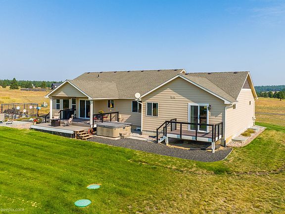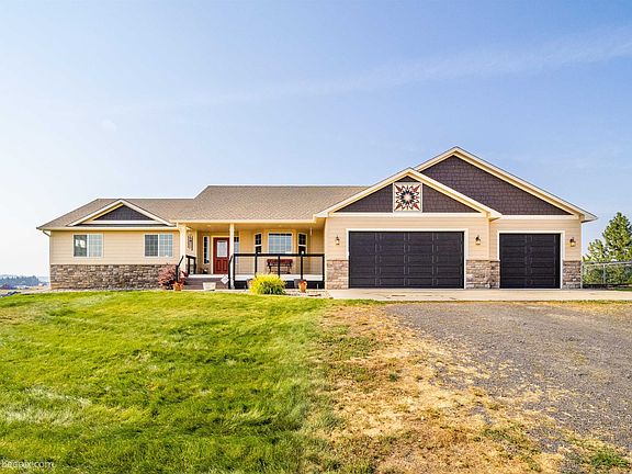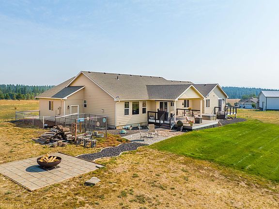 Fabulous views from all directions in this gorgeous rancher on this 10 acre lot, including a beautiful view of Mt. Spokane. Home has a private deck with a hot tub, a fire pit area , and plenty of outdoor space for entertaining. 3 car garage, plenty of room for RV parking or build your own shop. Home has sprinkler system, 50 GPM well, and room for a garden. 4+ bedrooms, Office/Den. Media room and 2 family rooms. Built in 2006 this home has it all. Ready to move in! New Carpet 3/16 15 Min From N. Spokane