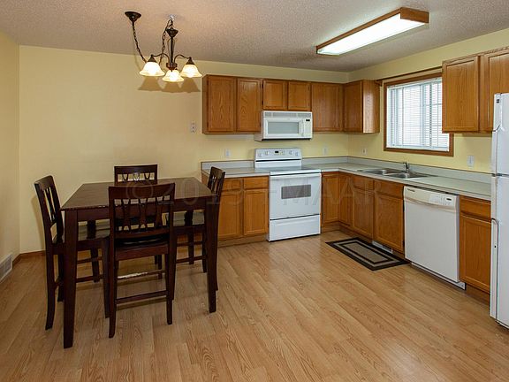 Enjoy 3 bedrooms up on this two story twinhome with almost no specials! Located on private cul de sac with charming front porch and double garage. Main floor is open with oak cabinets in kitchen, appliances included and 1/2 bath. Upper level has 3 bedrooms and 2 baths. Basement has family room laundry with washer & dryer included and storage. This is so much space for the money!