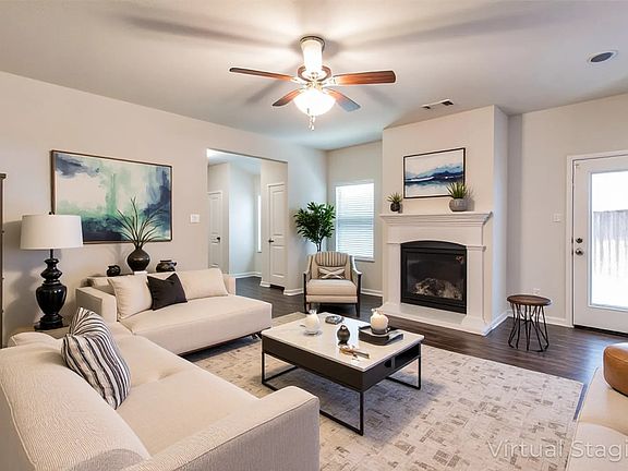 Step inside to discover elegance and warmth, defined by beautiful hardwood flooring throughout the entire main level. The open living area is bathed in natural lighting and centered around a cozy wood-burning fireplace, perfect for gathering on cool Texas evenings. The kitchen is fully equipped with sleek stainless steel appliances.
