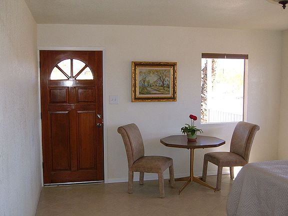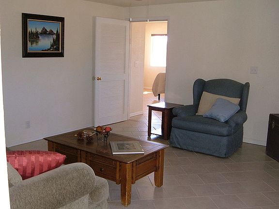 Newly remodeled in 2017. Spacious and roomy feel with an unusual floorplan allows home to function as a duplex with a master suite with it's own entry. Home has all new kitchen and tile floors throughout, tile in tub and shower, new cabinets in bath and fenced backyard. French doors open onto a large covered patio. Large two car garage with washer and dryer hookups. Quiet neighborhood and good dirt road, just 1/2 mile off paved road (Border) in Joshua Tree. All appliances are included, fully furnished if you want. This is a great investment or starter home ready for you now.