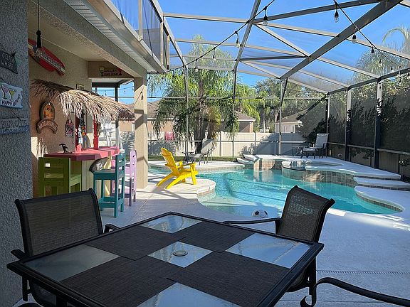 Entertaining Mecca! Come see this one owner beautifully maintained, fully furnished 4 bedroom 3 bath pool home with it's very own bar and lounge area! Your new home will definitely be the place where all your friends will want to come join you for Friday night Happy Hour! Outside, the pool area is just stunning with a tropical bar, tons of seating, a separate covered grilling area with propane hookup. You'll never run out of gas again using grill tanks since this home has a leased buried propane tank which also heats the pool and hot tub. The pool equipment was all replaced in 2017 and upgraded to an energy efficient pump, new heater, filter and color changing LED pool and spa lighting. The pool features beautiful lines and curves with it's own table and stools built right into the pool! This home features a large Master Bedroom with a full size separate study/office area, double walk-in closets, double vanity bathroom with large shower and separate jacuzzi tub. The furniture is modern and beautiful, real wood, very high quality and would cost nearly 10K to replace. The master suite is opposite the other three furnished bedrooms which are all good size with functional closets and ceiling fans. The 4th bedroom can be closed off behind a separate door and shares access to the pool bath. The kitchen has stainless appliances with a double oven and a separate pantry area. The family room is furnished with a leather couch and sofa, both with recliners, an entertainment console with 55" Samsung high definition TV and 7.1 surround sound with Polk Audio speakers in the ceiling for that cinematic experience. The Living room off the foyer and bar area is nicely appointed with comfortable seating and a pub table and bar stools for nights when you have overflow from the main bar. The bar was a 25,000 upgrade to the home which features high end refrigeration systems for your kegs and beverages, glass cabinets with built in lighting, stunning granite and crown moldings, bar stools for eight-nine people, two TV's, sound system and all the things you'll need to start making your new home your favorite place to go out too! The two car garage is oversized and can even hold a full size F-150 pickup truck. There is a charging outlet for your electric vehicle. The double driveway has been extended for extra parking and there is a 50 AMP plug for getting your RV ready for the next camping trip or it can also be used as a generator backup plug to feed power to the rest of your home during power outages. This home will absolutely not disappoint! Please call or email for a private showing. Realtors bring your clients and you'll be compensated accordingly. More pictures coming soon!