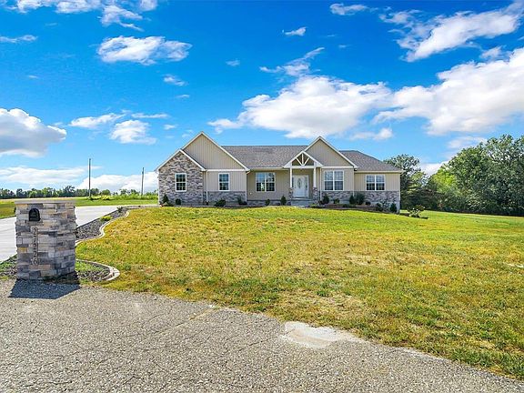GORGEOUS NEW CUSTOM HOME IN BEAUTIFUL NEIGHBORHOOD! With almost 2200 square feet of main floor living space on 3 level acres and blacktop streets, this dream home has it all. Special features include an oversize 3 car garage, large covered front and back porches, professional landscaping, open floor plan with floor to ceiling masonry fireplace, separate dining/home office area, delightful custom kitchen with large center kitchen island with bright soft-close cabinets and walk-in pantry. DOUBLE YOUR LIVING SPACE with side walkout basement with rough in plumbing. Other great features include stone veneer and lateral vinyl siding, luxury vinyl plank flooring, granite countertops, master suite with a walk-in closet, shower and tub. Enjoy lunch or dinner and a glass of wine at Cedar Lake Cellars just around the corner. With a short hop off of Hwy 70 just west of St. Charles County this is convenient quiet country living at its best! OPEN HOUSE SUNDAY OCTOBER 1ST, 12-2!
