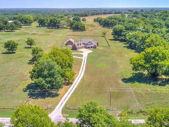 Just 7 miles Southeast of Bartlesville! The Ramona address will fool you, this property is closer to Bartlesville, just off Doty's Dumps (2700 Rd). This beautiful 5 bedroom, 5 full bath home has 2 living spaces, plus office, and sits on 2.61 acres. 40 X 24 Dream shop matches the home, has elevator to huge loft storage space, has a concrete floor, and electric. Three car attached garage has 1 overhead door on back for drive through. Storm shelter in garage. All appliances replaced in 2018 & 2019, including refrigerator, washer/dryer, which remain. Whole house water filter and water softener. The main living room has a soaring 2-story ceiling, with custom made barn door shutters covering 2 transom windows near the top. Hand scraped hardwood floors and a wood burning fireplace also grace the room, which is open to the kitchen and eating space. Kitchen has granite countertops, center island, eating bar, and one food pantry within the room; a larger butler pantry is located in the hall. Primary bedroom + 1 additional bedroom with nearby full bath are downstairs, the other three bedrooms, game room, and 3 full baths are upstairs. Separated Primary bedroom has bay window, door to covered patio, and private luxury bath- featuring a whirlpool tub, separate shower, water closet, and large walk-in closet. Stately office near the front door has 2 beautiful custom pieces of office furniture, which are available for sale. Upstairs, the 3rd bedroom has a private full bathroom and walk-in closet. The 4th and 5th bedrooms share a Jack & Jill bathroom, each bedroom with ample closets. The game room over garage also has a private full bathroom, perfect spot for guests. Large stone patio is partially covered, has fireplace, and overlooks the beautiful fenced yard. Land is fenced, backyard separately fenced with nice rail and black chain fencing. Paved roads.
