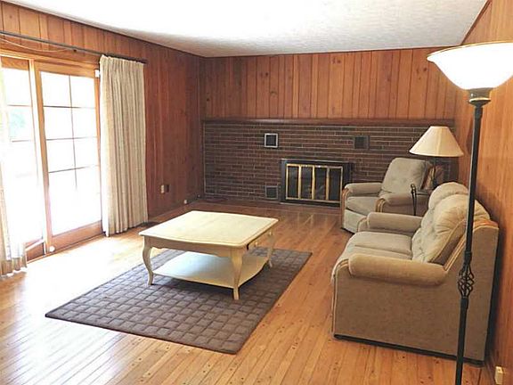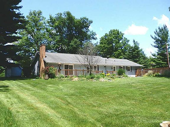Charming 3 BR ranch with almost a one acre lot. Dining area is off kitchen/bar/desk area and all appliances stay. Washer/Dryer hookup is on main floor. Beamed ceilings, fenced area around the in ground swimming pool. Large wood deck off back of home, recessed lighting, family room/gas log fireplace, wood pellet stove, shed, hardwood flooring, partial basement with a battery backup sump pump and master suite with half bath. Covered front porch overlooking the large treed yard and blacktop drive. Workbench and many tools and pool equipment stay. Heated garage + refrigerator stay. Access to front porch and attic from garage. Propane tank buried. Don't miss out on this gem! Owner passed away in home.