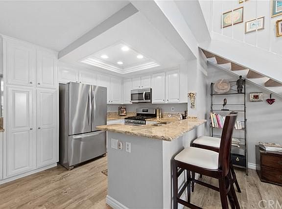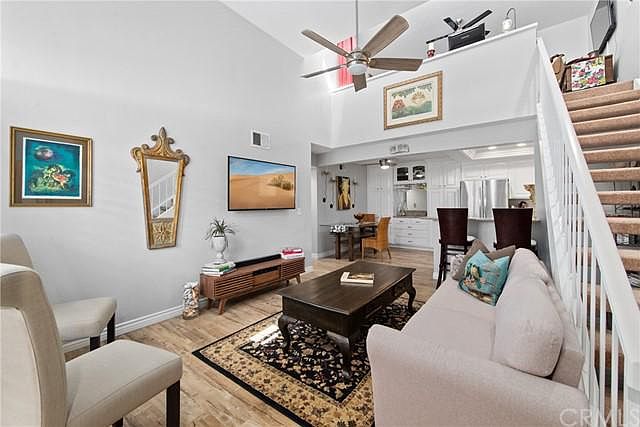 One Bedroom PLUS A LOFT for an office or second living area. The upgrades and updates are gorgeous in this upper level unit with no one above you. You also enjoy wonderful quiet and privacy with the home located in the interior of the complex. This condo is flooded with natural light from the well placed windows and vaulted ceilings. The kitchen has been upgraded with beautiful Granite Counters, White cabinets and Stainless Steel appliances. There is so much storage with the many cabinets in the kitchen as well. Property has a newer Air Conditioning Unit. Living space has a small bar area and boasts plenty of storage in the unit. There are two closets in the primary bedroom; one is a walk-in. The bathroom has been beautifully updated in the latest trends as well. Close to plenty of dining and shopping. Located twenty minutes away from the beach and Dana point harbor close to the 5 and 73 freeways. HOA includes trash and water.