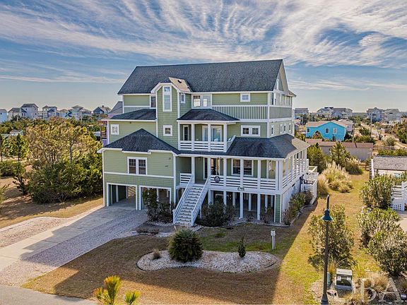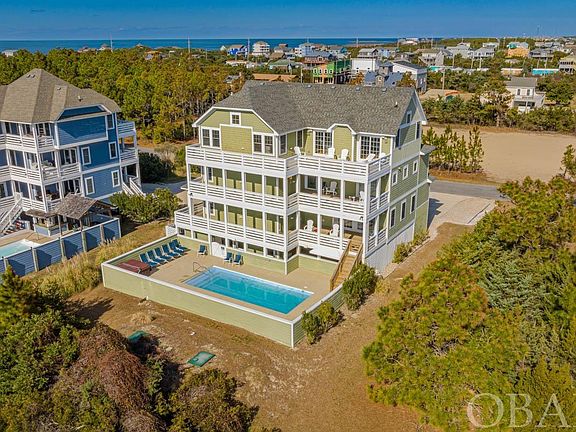 Experience bliss in this grand 5,300 square foot home located only 3 lots from the oceanfront in the premier Hattie Creef Landing Subdivision in Salvo. With its wide and uncrowded beaches, as well as its easy access to the Pamlico Sound. This popular destination is known for fishing, kiteboarding, windsurfing, SUP and kayaking, and surfing. The ground level has great parking, an under-house elevator entry, storage, outdoor showers, and a concrete pool with a hot tub. The first-level game room has features Ping-Pong table, a kitchenette, deck access, and a nearby half bath. A theatre room with seating for six has an ice maker and a wine fridge. Both bedrooms share a full bath with a shower. On level two, there is a third bedroom with deck access and shares a full bath featuring a huge tiled shower with the fourth bedroom. There is an office on this floor and the fifth bedroom has a bath with a tub/shower and deck access. The top floor great room has cathedral ceilings, pinewood floors, a half bath, professional decorations, an entertainment center with a flatscreen TV, a gas fireplace, and south-facing sundeck access where you'll have views of the ocean and sound. The tiled kitchen has stainless steel appliances. The primary bedroom has large bath with a shower. Guests love the house and the new owner will too. Topping $99,000 in owner gross income for 2022 and over $32K for 2023 this is an easy choice! You will surely appreciate the work put into making this one of the island's best opportunities in turn key condition.