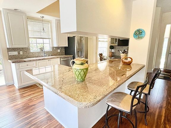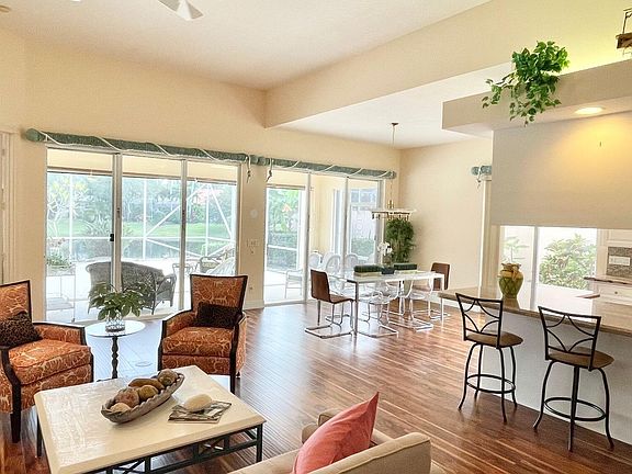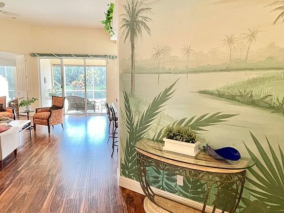 This beautiful ''Oakmont'' is in move in condition! As you enter the foyer you will be impressed by the stunning custom mural which reflects the glorious lake view from the backyard. The Great Room has 12ft ceilings with a built in entertainment center and opens to the kitchen and dining area, perfect for entertaining. The primary bedroom suite has a dual bathroom arrangement with a large walk in shower, Roman tub, walk in closet and sliders leading to the large screened patio. The kitchen has granite counters, premium stainless appliances and pull out shelving. High quality laminate flooring throughout, central vacuum, central alarm. Laundry room with full size washer, dryer & utility sink. Sip your morning coffee from the huge screened patio overlooking the tranquil lake, paradise!