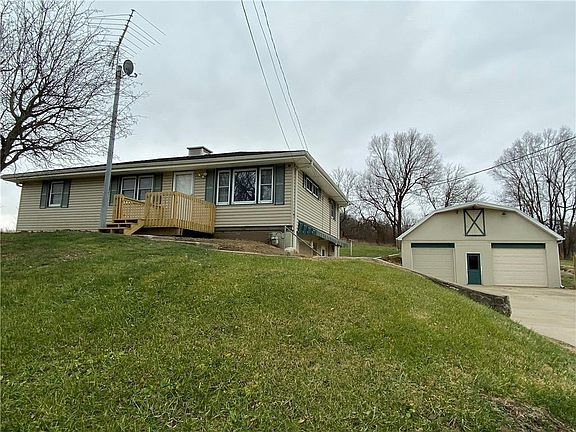 COUNTRY IN THE CITY. Quiet, peaceful countrylike atmosphere includes 4.95 acres. One owner home features vinyl siding, brand new wood deck, central air, basement garage plus large oversized 2 car detached garage with floored upper level, concrete floor and tons of space for workshop and storage. Land is across the street from house located at deadend. Land contains 2 barns and lots of walnut trees. Seller will be reseeding yard. Sutton Contracting just completed foundation work to house and garage.