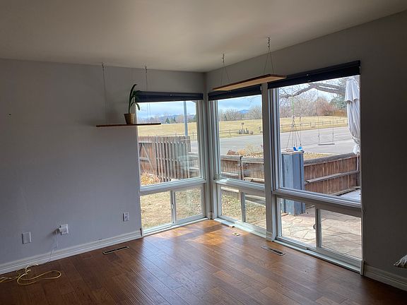 Corner unit 3 bedroom 1.5 bath townhome directly across from lake Sherwood with great view of longs peak out living room window. Access to pool, playgrounds and green space. Convenient access to Power trail for walking, running or biking. Home is hardwood laminate throughout, ample lighting and open dining/living area. Large bedroom has its own entry/exit door. Updates include recessed lights, whole house attic fan for energy efficient cooling in summer time and custom shelving and storage. Washer and dryer hook ups (washer included). Covered parking and outdoor storage shed included.