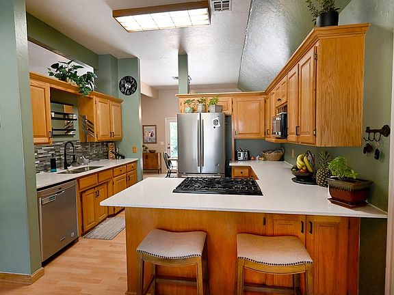Located on nearly half an acre and backing to a heavily wooded greenbelt, this beautifully updated home offers privacy, space, and comfort in the sought-after Sangre Ridge Elementary district. The main level features three bedrooms, including a spacious primary suite with private access to the back patio. The easy flow layout connects the kitchen, dining, and living areas, enhanced by high ceilings and large windows that flood the space with natural light. Upstairs, a versatile fourth bedroom with a full bath and walk-in closet offers the perfect, private guest suite or bonus space. Recent upgrades include new quartz countertops in the kitchen and all three bathrooms, a new range, new hot water tank, updated light fixtures throughout, and new upstairs windows with a window A/C unit. The kitchen showcases custom oak cabinetry, a built-in pantry, and a cozy breakfast area accented by a cork feature wall. An oversized two-car garage provides a plethora of storage, while a nostalgic mature tree in the front yard adds charm and morning shade. This home blends thoughtful updates with timeless appeal in a peaceful, wooded setting.