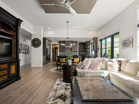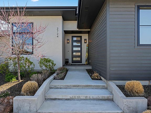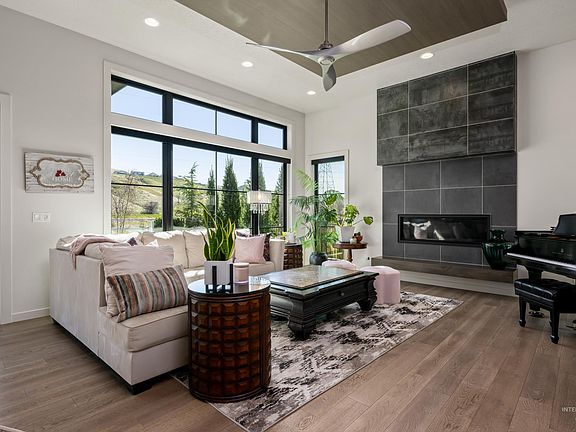 MODERN TREY HOFF DESIGNED SINGLE-LEVEL HOME ON A PREMIER LOT WITH UNOBSTRUCTED VIEWS! Dream home with significant upgrades including current colors, modern lighting and plumbing fixtures, hardwood and tile floors, custom cabinetry, and inspired architecture. The Great Room has a dramatic suspended ceiling, a tile floor-to-ceiling linear fireplace, and tall windows that allow natural light and incredible views. The Gourmet Kitchen features beautiful sleek cabinetry, a center island/breakfast bar, a butler's pantry, two sinks, leathered quartz countertops, Viking appliances and double ovens. The Primary Suite has a luxurious Primary Bathroom with a tile walk-in shower, his and her vanities, and a walk-in closet. It has a striking stucco stone exterior with black windows. It enjoys an extended covered patio and a fenced backyard with mature professional landscaping! Excellent community amenities. Close to the River, Greenbelt, and downtown Boise! It’s not just a home; It’s a lifestyle!