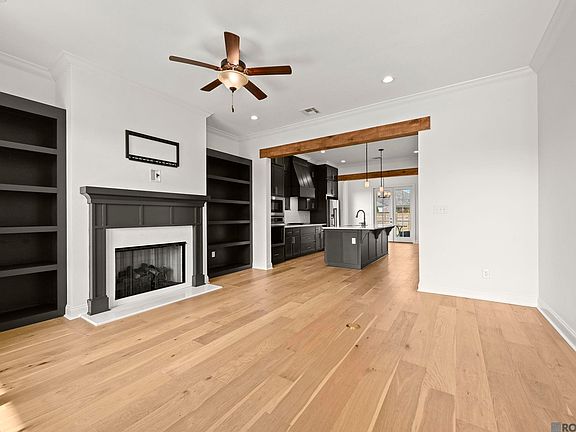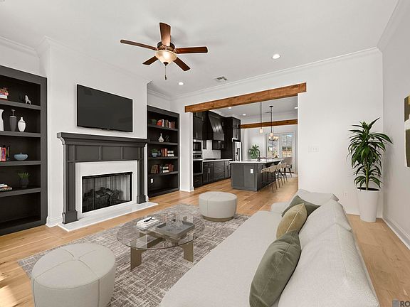 Charming cottage-style home located in the desirable Water's Edge in Lexington Estates, offering 3 bedrooms, 2 bathrooms, and 1,670 sq ft of living space with timeless design and modern finishes throughout. The home features a bright, open-concept layout with beautiful hardwood flooring, crown molding, and abundant natural light. The gourmet kitchen is a true showstopper, complete with quartz countertops, custom cabinetry, a stylish backsplash, stainless steel appliances, and a large center island—perfect for entertaining or casual dining. Exposed wood accents and designer lighting add warmth and character to the space. The living area is anchored by a cozy fireplace flanked by custom built-in shelving, creating a welcoming focal point. The primary suite offers a peaceful retreat with a spacious en-suite bathroom, featuring a separate shower, soaking tub, and a large walk-in closet. Step outside to enjoy the fully fenced backyard with a covered patio, ideal for relaxing or hosting guests. This home seamlessly blends classic style with modern comfort in a sought-after community.