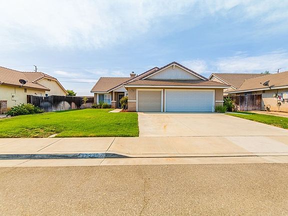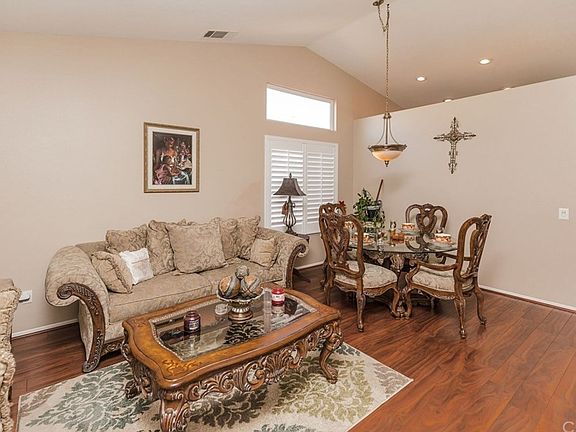 WOW! What a RARE and beautiful SINGLE STORY HOME with a 3 car garage! This desirable home boasts 1,609 square feet, 3 bedrooms, 2 bathrooms, on a private lot. This home features an open-concept floor plan with beautiful wood-laminate flooring, wooden shutters, a large family room which is open to the kitchen ,a dining room & living room combo and an additional indoor laundry room. The kitchen offers a center island with tons of cabinets. tile floors, a pantry, dishwasher and plenty of counter top space. The spacious master bedroom and bath features a walk-in closet, dual sinks and a walk-in shower. All bedrooms are good sized. Enjoy this back yard in privacy with your large patio cover, astro-turf and drought-tolerant landscaping! This family friendly neighborhood is close to shopping, schools, hospitals, and easy access to the 215 freeway. All this in a community with a low taxes and no HOA! This home is move-in ready!