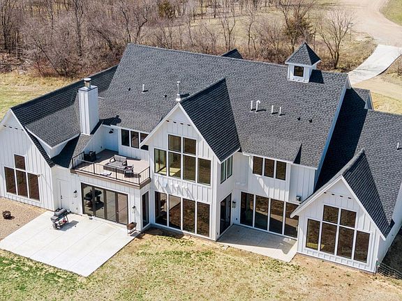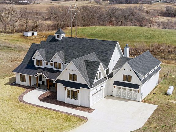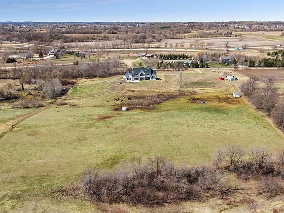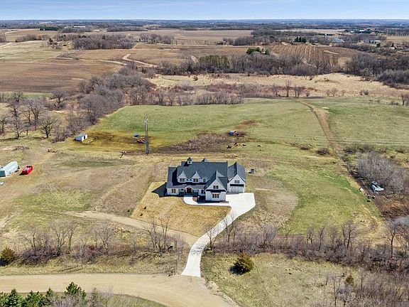 Remarkable 2022-built estate by Pebble Creek Homes, set on over 59 acres just 5 minutes south of Lakeville and less than 30 minutes to the airport. As you step through the grand front doors, you will be captivated by the abundance of natural light streaming through floor-to-ceiling windows illuminating the interiors. The kitchen exudes culinary excellence with its massive island, 8 burner cooktop, double ovens, custom hood, and incredible pantry. The main level family room invites relaxation with its fieldstone wood burning fireplace and walk-up bar. Retreat to the primary suite, a haven of tranquility with its cathedral ceiling, dual walk-in closets, and spa-like bath featuring a separate tub and steam shower. Upstairs, find a family room, exercise room, deck, and three additional bedroom suites, one with a hidden gem, a secret door to its private den/TV area. There are also two separate heated garages, one with a dog washing room and one that doubles as an indoor sport court.