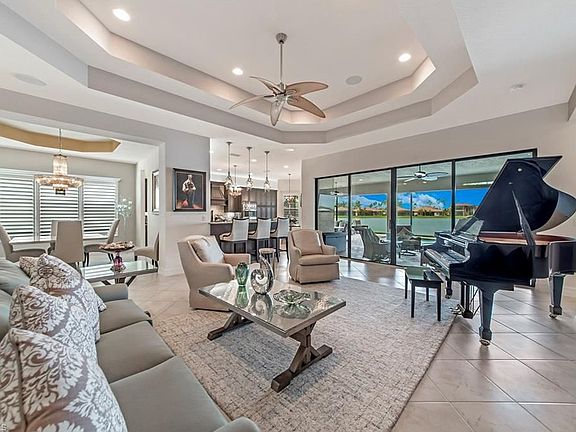 H.12274 Highly sought after Carlyle model situated on a PREMIUM WESTERN EXPOSURE LAKE VIEW lot with an abundance of upgrades. Extended Screened in Lanai featuring GAS HEATED SALT WATER POOL & SPA with an Outdoor Kitchen featuring a GAS GRILL, refrigerator, sink and stone countertop. Gourmet Eat In Kitchen overlooking the lake features Viking Appliances to include GAS COOKTOP, Double Wall Ovens, Center Island and Breakfast Bar. Upgraded cabinetry to include oversized pantry with pullouts and soft close cabinets and drawers. Spacious Master Suite featuring 2 generous custom built walk in closets and Master Bathroom featuring a large walk in shower with separate soaking tub and dual vanity sinks. 2 Guest Suites have their own walk in closets and bathrooms. An additional Club Room with coffered ceiling could be a 4th Bedroom or office offering a separate entrance outside and to the 3rd car garage. Walk in Bar with upgraded cabinetry, ice maker and wine cooler. Laundry room with custom built closets and cabinets with oversized stone countertop and sink. State of the art SONOS HOME AUDIO system inside and out. Plantation shutters, beautiful ceiling fans and light fixture.