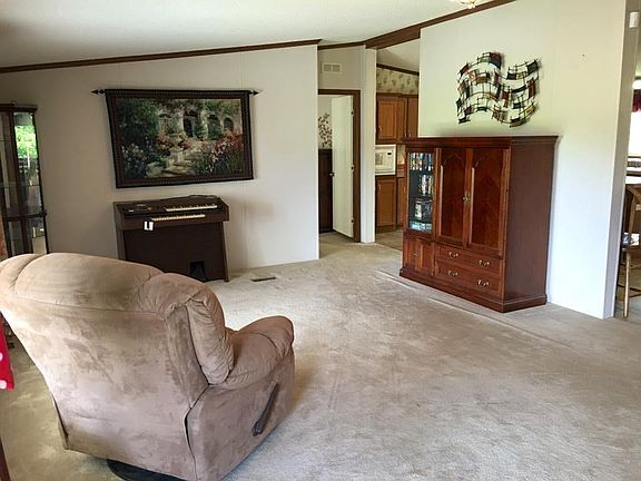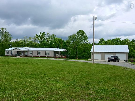 Spacious 2560 sq ft 2004 Mobile home, brick foundation on 6.5 acres. 4 beds, 2 baths, with extra family room, utility room and large hallway with office space. Covered front and side porches. 24x38 detached 3 car garage with attic. Comes w/stove & fridge